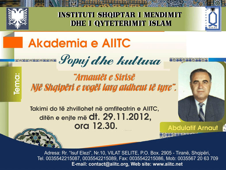Duke gjetur të përshtatshme kohen dhe momentin historik, AIITC organizoi akademin e parë “Popuj e kultura” me takimin: “Arnautët e Sirisë – Një Shqipëri e vogël larg atdheut të tyre”, ku z.Arnauti foli rreth pranisë shekullore të shqiptarëve në Siri, për jetën dhe traditat e tyre, mbi ndikimin social e kulturor të tyre në vendet arabe dhe mbi kontributin e tyre për çështjen kombëtare.